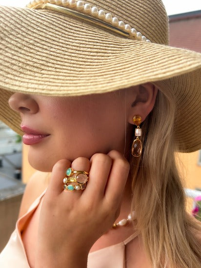 Morganiitti-korvakorut, jotka on kullattu 18k kullalla, yhdistävät luonnollisen kauneuden, ylellisen säihkeen ja eleganssin. Pehmeän vaaleanpunainen morganiitti hehkuu rauhoittavasti, ja 18k kullan lämpö tuo korvakoruihin ainutlaatuista kiiltoa. Korvakoruissa on myös kauniita makeanvedenhelmiä ja lämpimän kultainen sitriini, joka lisää niihin säihkettä ja eleganssia. Nämä korvakorut vangitsevat valon kauniisti ja tuovat ripauksen säihkettä jokaiseen asukokonaisuuteen, olipa kyseessä juhla tai arki.