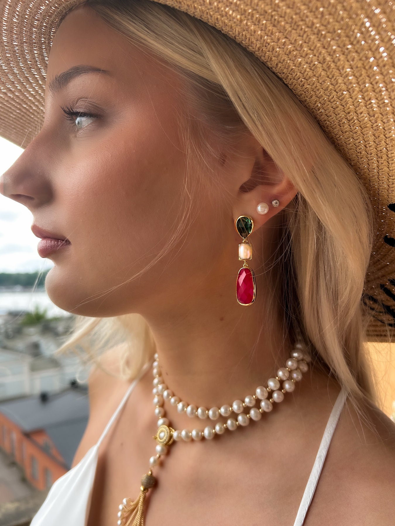 Morganiitti-korvakorut, jotka on kullattu 18k kullalla, yhdistävät luonnollisen kauneuden, ylellisen säihkeen ja eleganssin. Korvakoruissa on kauniita makeanvedenhelmiä, vihreää onyksia ja pinkkiä jadea, jotka lisäävät säihkettä ja värikkyyttä. Nämä korvakorut vangitsevat valon kauniisti ja tuovat ripauksen säihkettä jokaiseen asukokonaisuuteen, olipa kyseessä juhla tai arki.