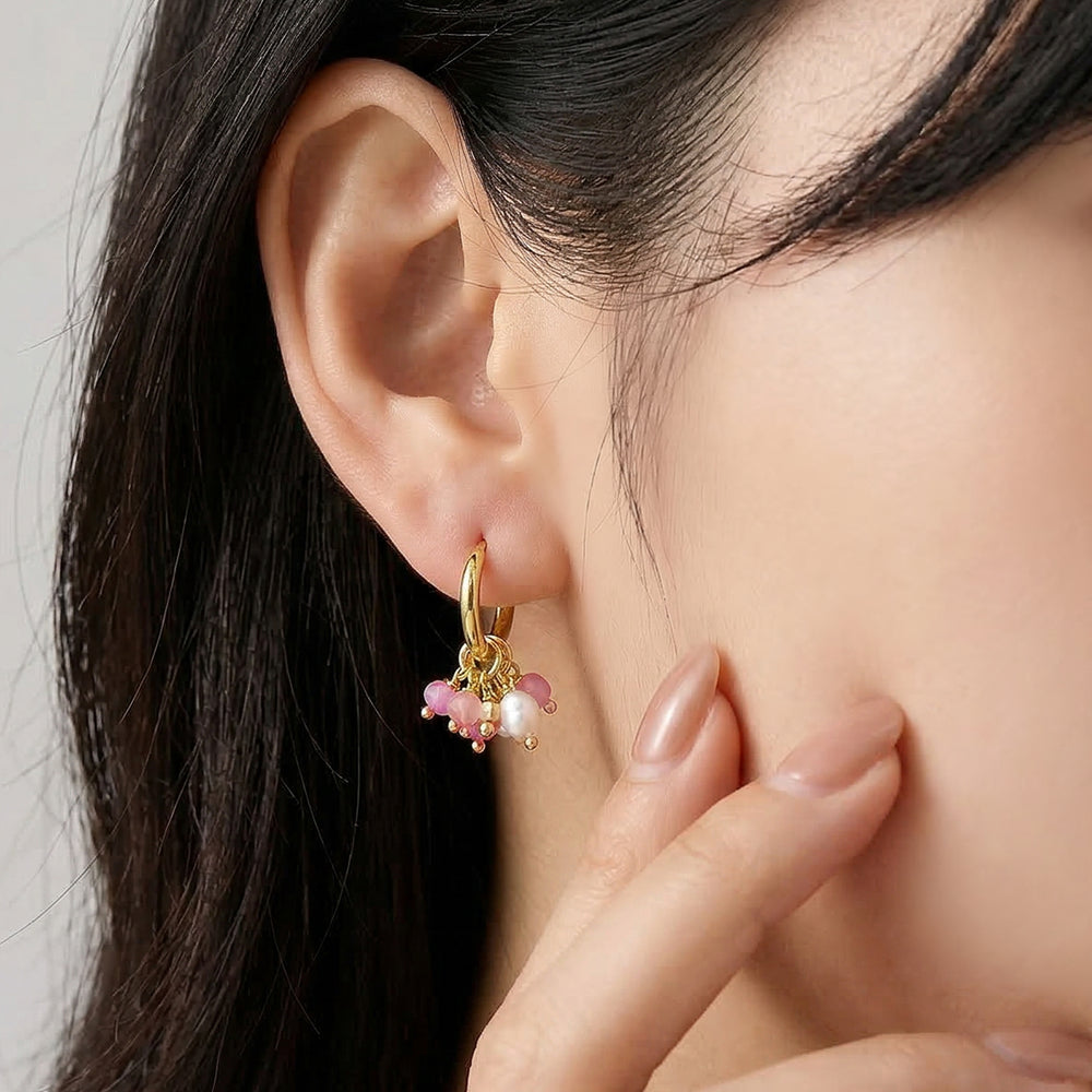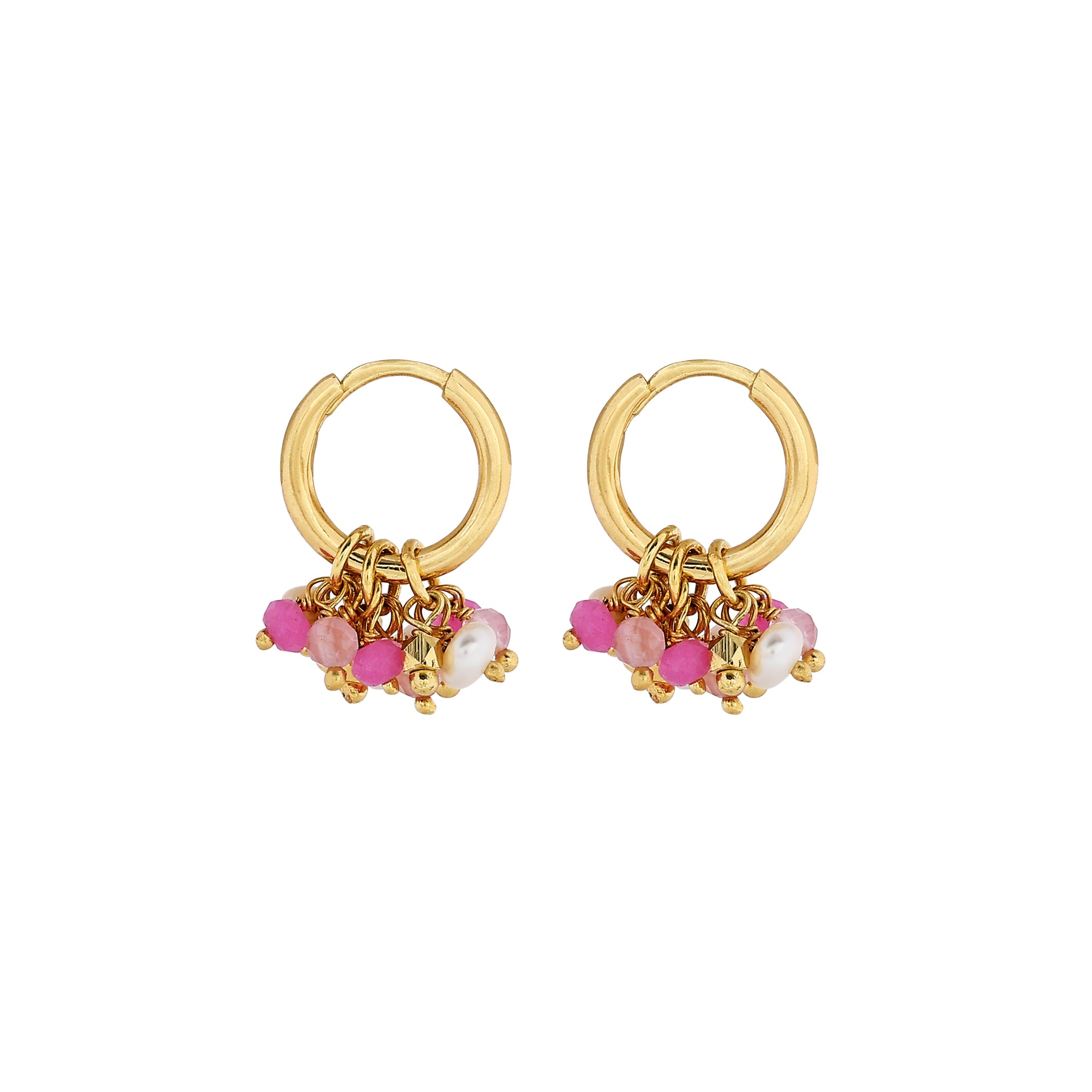 Näissä lumoavissa rengaskorvakoruissa yhdistyvät ylellinen muotoilu ja herkät yksityiskohdat. 18 karaatin kullalla pinnoitetut renkaat luovat ajattoman ja elegantin pohjan, jota koristavat pehmeän vaaleanpunainen jade.